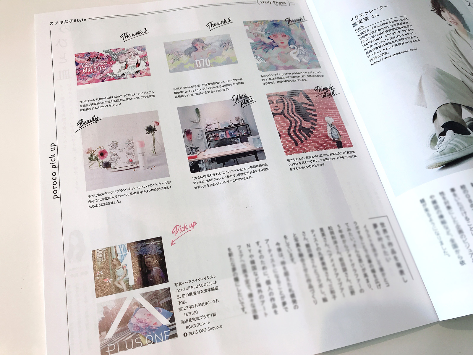 お仕事に2013年札幌PIVOTポスタービジュアル・短編映画・第13回札幌国際短編映画祭ポスタービジュアル、女性誌『Gina』『ar』『sweet特別編集占いBOOK』『PHP』『LDK the Beauty』などの雑誌や書籍の挿絵など全国で活動中。